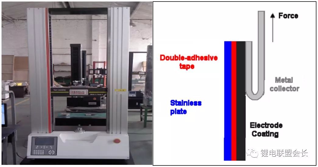 用雙面膠將待測面固定在剛性的支架上,另一面貼在不銹鋼板上,然后將不銹鋼板和集流體固定在設備的兩個夾具上,開始測試,設備以一定的速度和載荷運行,當集流體完全被剝離下來的力就是剝離力。需要指出的是,一個極片的正反兩面其剝離強度往往是不一樣的,在實際生產過程中需要注意,兩面的剝離強度最好不要相差太大,相差太大會導致在使用過程中產生陰陽面的現象,影響電池的性能。